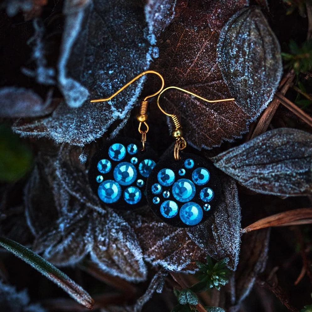 Nahkaiset, strassikivin koristellut Versumi-korvakorut sopivat talvisen kimpun kaunistukseksi.